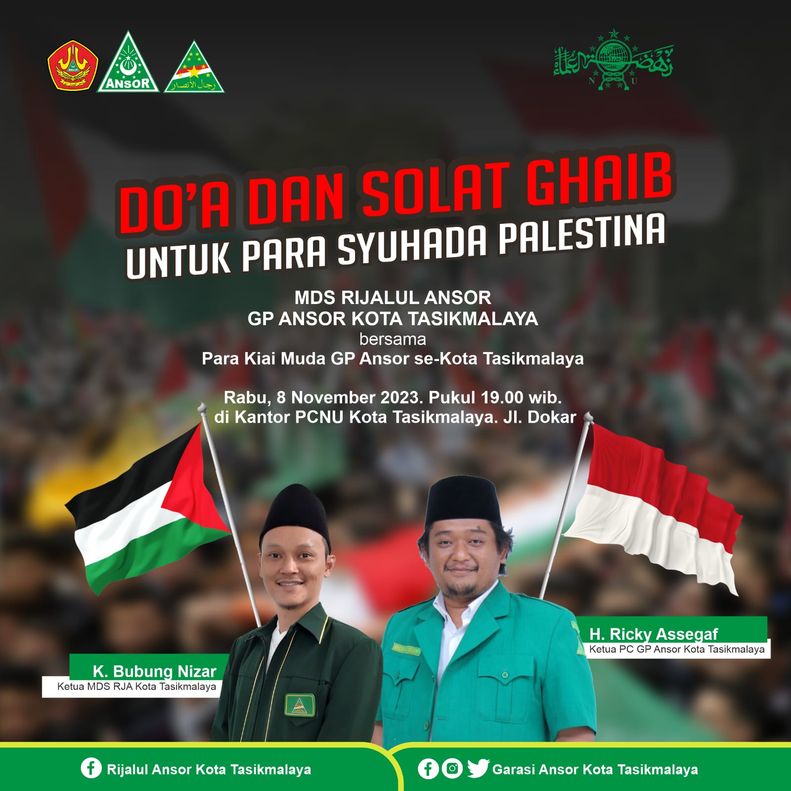 Di Tasikmalaya, Gerakan Pemuda Ansor mengadakan doa bersama dan Salat Gaib di Mabes Ansor Kota Tasikmalaya Jl.Dr. Soekardjo No 47 Tawang Kota Tasikmalaya. “Doa adalah cara yang kuat untuk menyuarakan dukungan dan solidaritas dengan orang-orang yang mengalami penderitaan di Gaza akibat konflik. Kami mengintruksikan kepada sahabat Ansor, Banser,Rijalul Ansor Se-Kota Tasikmalaya untuk hadir” papar H.Ricky Assegaf, Ketua PC GP Ansor Kota Tasikmalaya