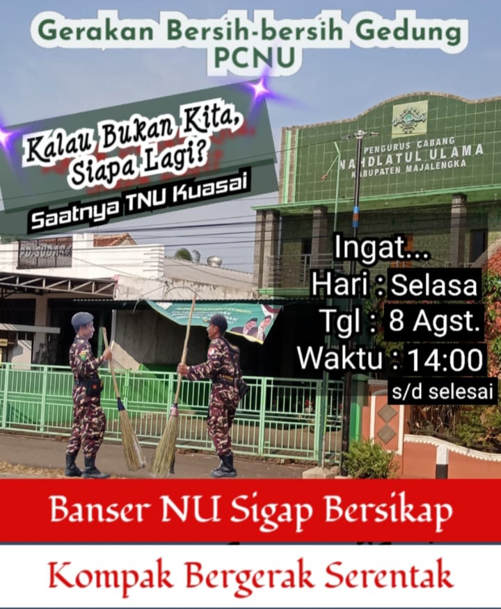 Dalam rangka memperingati Tahun Baru Islam dan Hari Ulang Tahun Republik Indonesia (HUT RI) ke-78, Kepala Satuan Koordinasi Cabang (Kasatkorcab) Banser Kabupaten Majalengka, Komandan Away, akan mengerahkan 313 Banser untuk bersih bersih di Gedung PCNU. Senin,(07/08/23).