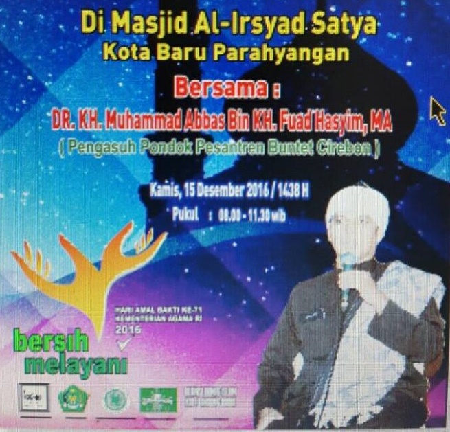 Ngamprah-, Dalam rangka peringatan Maulid Kanjeng Nabi Besar Muhammad SAW 1438 H. dan Hari Amal Bakti ke 71, Kementerian Agama Kabupaten Bandung Barat menyelenggarakan Tabligh Akbar pada Kamis (15/12), bertempat di Masjid Al-Irsyad Kota Baru Parahyangan, Padalarang. Bekerjasama dengan DKM Al-Irsyad dan PCNU KBB, tabligh akbar ini menghadirkan Pengasuh Pesantren Buntet Cirebon Dr.KH. Muhammad Abbas bin KH. Fuad Hasyim, MA. Dijawalkan acara akan dilaksanakan pada pukul 08.00-11.30. Bagi masyarakat Bandung Barat yang memiliki waktu luang, bisa datang langsung ke lokasi acara untuk tholabu al-ilm riwayat kehidupan dan perjuangan Nabi Agung Baginda Rasul SAW. (Rus).
