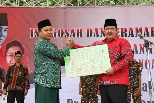 Foto: Bupati Pangandaran, Jeje Wiriadinata (kanan) menyerahkan bantuan sebidang tanah untuk pembangunan Kantor PCNU Kabupaten Pangandaran beberapa waktu lalu