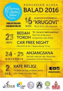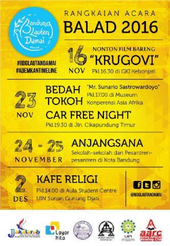 Untuk tahun ini rangkaian acara Balad akan digelar empat kegiatan. Kegiatan awal (16 November) dengan nonton film bareng “Krugovi” sekaligus launching acara di GKI Maulana Yusuf. Berikutnya (23 November) bedah tokoh Mr.Sunario Satrowardoyo di Museum KAA dilanjutkan kampanye di Care Free Night Jl.Cikapundung Timur, Anjangsana Sekolah dan Pesantren di Kota Bandung (24-25 November), dan puncaknya Kafe Religi (2 Desember) di Student Centre UIN Bandung. (Edi).