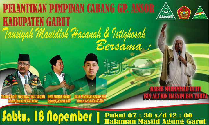 Maulana Habib Luthfi bin Yahya terkonfirmasi akan menghadiri Pelantikan Pimpinan Cabang Gerakan Pemuda Ansor Kabupaten Garut yang akan dihelat di Alun Alun Ottista Garut. Sabtu, 18 Nopember 2017.