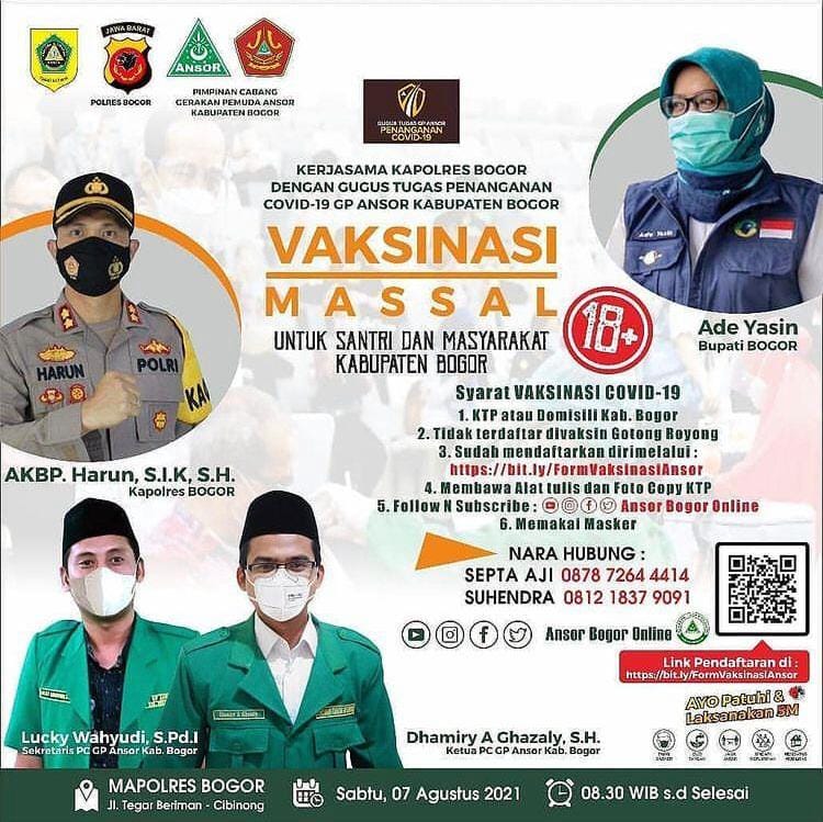 Ketua Cabang GP Ansor Kabupaten Bogor Dhamiry A Ghozaly mengatakan, program vaksinasi massal ini kita bekerjasama dengan jajaran polres Bogor, bertujuan memutus penyebaran virus Covid 19.