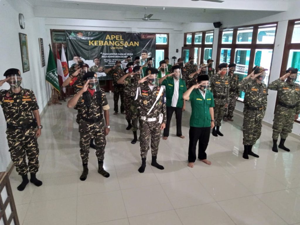 Cimahi, NU Online Jabar. Pimpinan Cabang GP Ansor Cimahi mengikuti Apel Kebangsaan yang diadakan oleh Pimpinan Pusat GP Ansor, pada Minggu (29/11). Apel ini diikuti oleh 50 orang yang terdiri dari 40 anggota Banser dan 10 orang pengurus Ansor Cimahi. Sesuai dengan arahan pimpinan pusat, perwakilan peserta apel dibatasi untuk menhindari jumlah orang yang terlampau banyak dan juga menghindari kerumunan. Peserta apel dari GP Ansor Cimahi mengikuti Apel virtual dari Aula Pondok Pesantren Jami’atul Quro Wal Hufadh, Cimahi. Seluruh pengurus yang menghadiri apel virtual ini tetap mengikuti protokol kesehatan, mulai dari cek suhu, cuci tangan, memakai masker dan face shield.