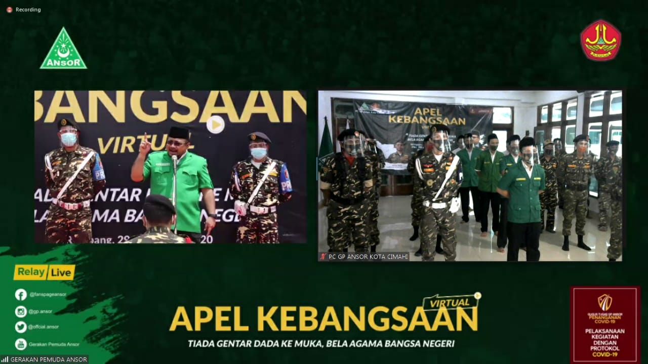 Pengurus PC GP Ansor Cimahi yang mengikuti Apel Kebangsaan ini hadir dari pukul 08.00 untuk memastikan terlebih dahulu semua anggota yang hadir sudah tes suhu dan menjalankan protokol Kesehatan. Apel dimulai pada pukul 10 pagi dan bertujuan untuk merespon dinamika politik belakangan ini yang berpotensi mengancam keutuhan bangsa. Apel virtual ini juga diikuti oleh 5 juta orang pengurus pimpinan cabang dan wilayah se-Indonesia.