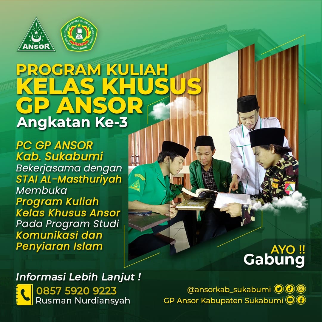 Pimpinan Cabang (PC) Gerakan Pemuda (GP) Ansor Kabupaten Sukabumi bekerjasama dengan Sekolah Tinggi Agama Islam (STAI) Al-Masthuriyah kembali membuka Program Kuliah Kelas Khusus Ansor angkatan ke-3.