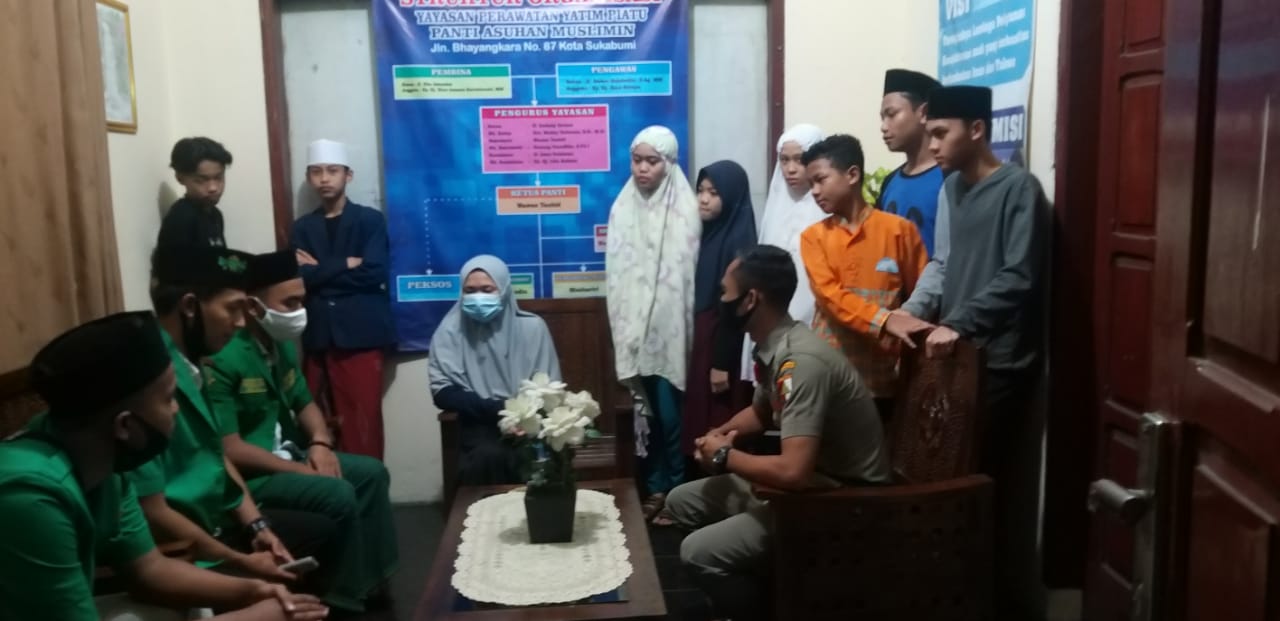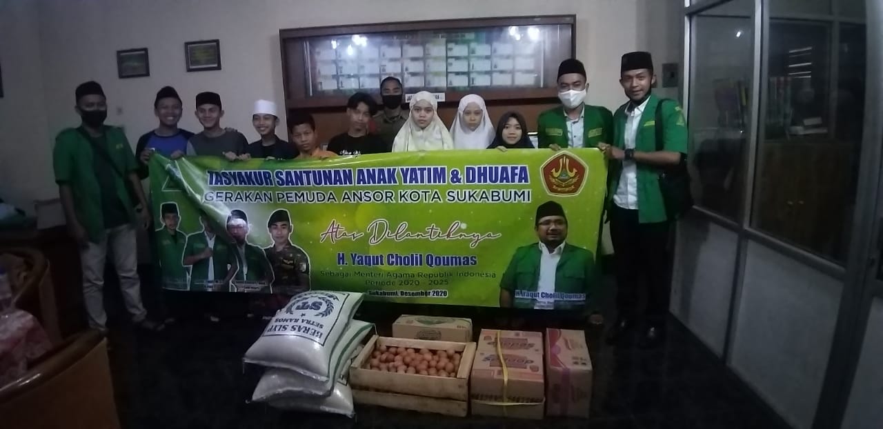 Kota Sukabumi, 23/12/2020. Pimpinan Cabang Gerakan Pemuda Ansor & Banser Kota Sukabumi menyambangi salah satu Panti Sosial Asuhan Anak di Jln. Bahayangkara No. 85 Kota Sukabumi. Kedatangan pengurus GP Ansor ke Panti Asuhan Muslimin ini merupakan tasyakur atas dipilihnya Ketua Pimpinan Pusat Gerakan Pemuda Ansor yaitu H. Yaqut Cholil Qoumas atau Gus Yaqut oleh Presiden Republik Indonesia menjadi Mentri Agama Kabinet Indonesia Maju RI Priode 2020-2025.