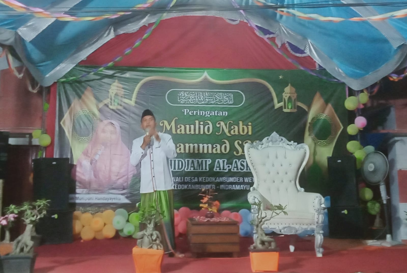 Ketua Tanfidziyah Majelis Wakil Cabang Nahdlatul Ulama (MWCNU) Kedokanbunder, Kiai Jabidin menghadiri acara peringatan maulid nabi yang diselenggarakan oleh warga Kedokanbunder Wetan di Masjid Jami Al Asror, Selasa (3/10/23) malam