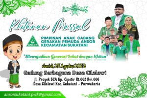Pimpinan Anak Cabang (PAC) Gerakan Pemuda (GP) Ansor Kecamatan Sukatani Kabupaten Purwakarta bakal menggelar sunatan masal, pada hari Jum’at (23/08/2023).