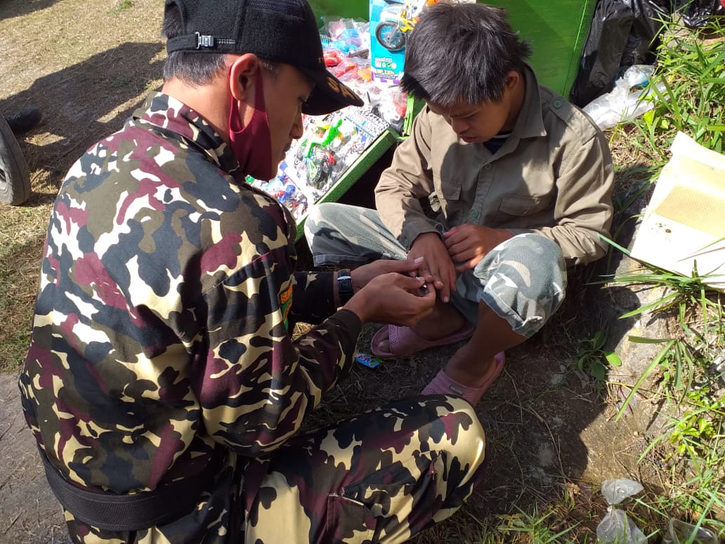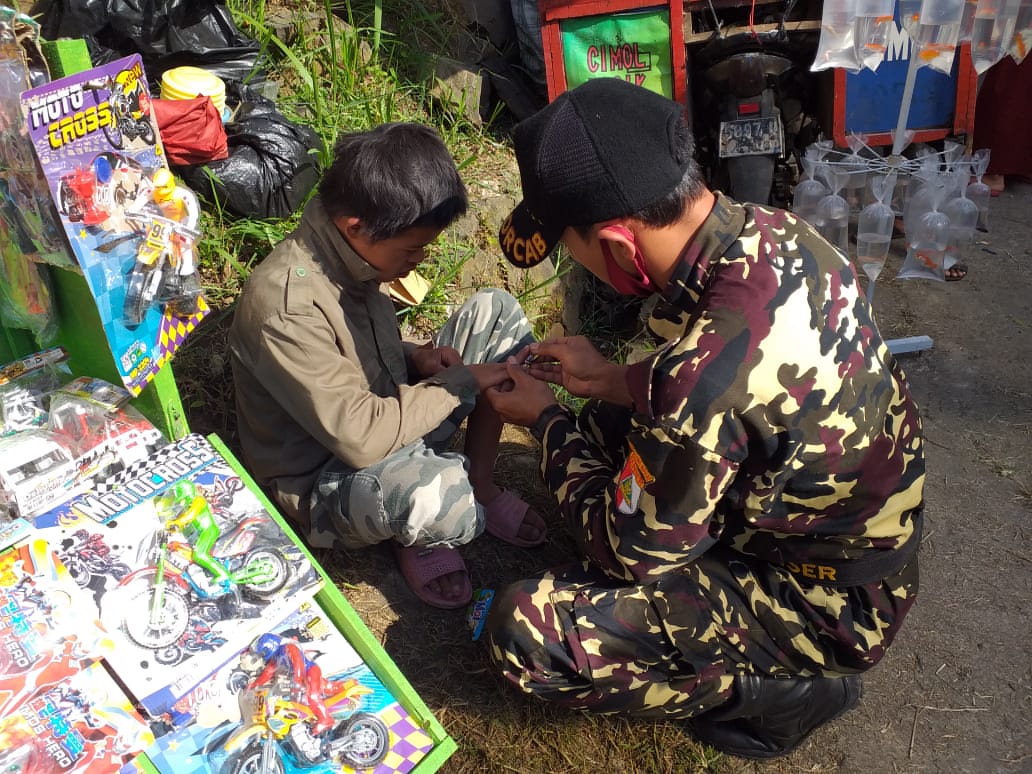 Tampak Anggota Banser berseragam lengkap, membersihkan kuku seorang anak.