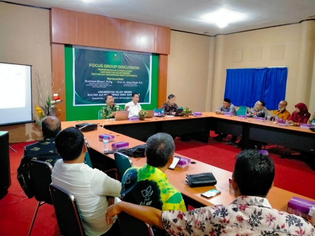 Kegiatan Focus Group Discussion (FGD) Pengembangan Karir Dosen UIN Sultan Aji Muhammad Idris Samarinda diikuti 40 dosen dari berbagai fakultas dan dihadiri oleh Wakil Rektor Bidang Administrasi Umum, Perencanaan dan Keuangan Prof. Dr. Zurqoni, M.Ag, Wakil Rektor Bidang Kemahasiswanaan dan Kerjasama Dr. M. Abzar D, M.A dan sejumlah civitas akademika lainnya.