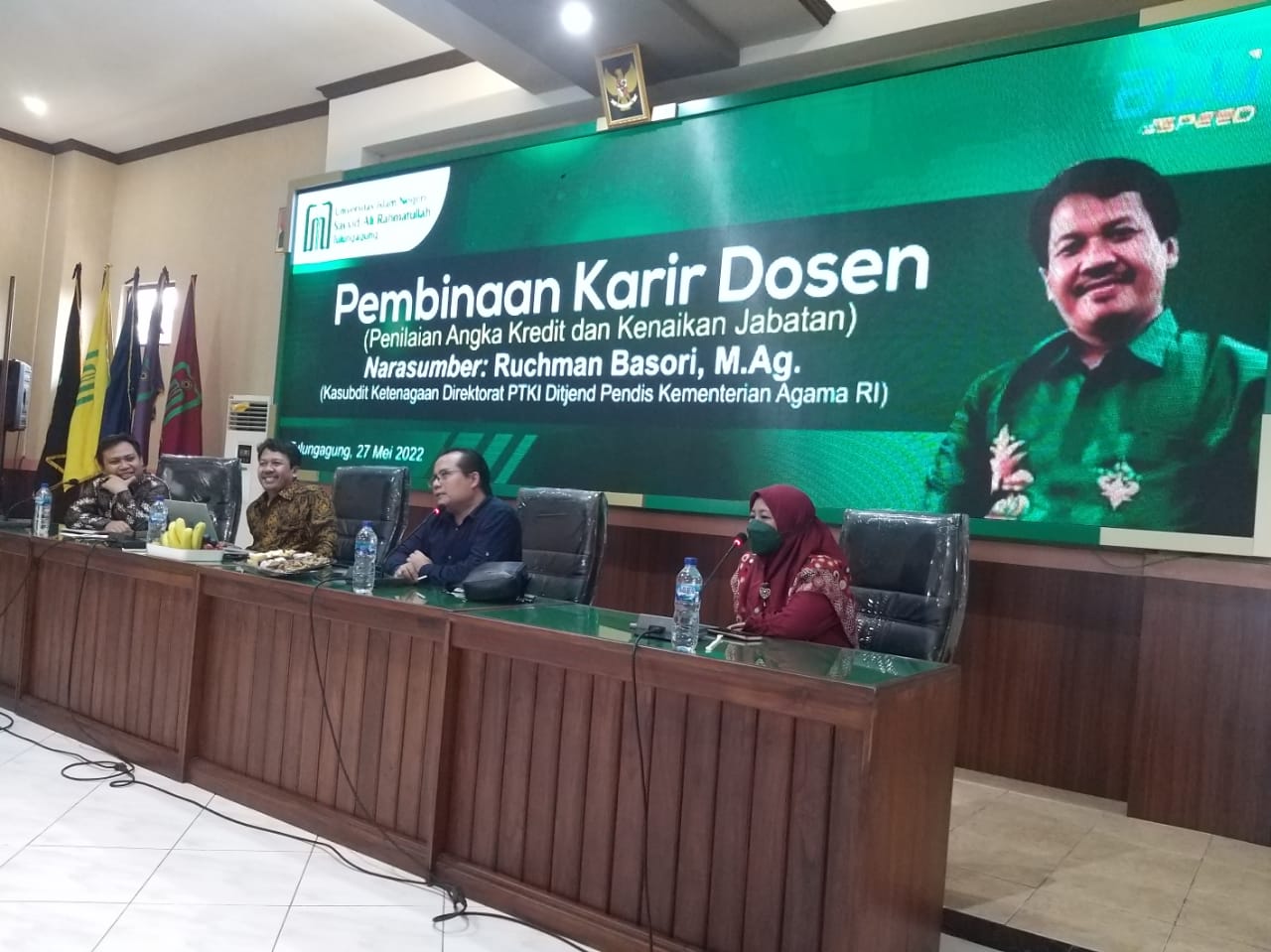 Dihadapan 50-an dosen muda UIN SATU, Alumni IAIN Walisongo ini mensosialisasikan Peraturan Menteri Agama Nomor 7 Tahun 2021 dan KMA Keputusan Menteri Agama Nomor 856 Tahun 2021 Penilaian dan Penetapan Angka Kredit Jabatan Fungsional Dosen Jenjang Lektor Kepala dan Profesor dalam Rumpun Ilmu Agama dilakukan oleh Kementerian Agama.