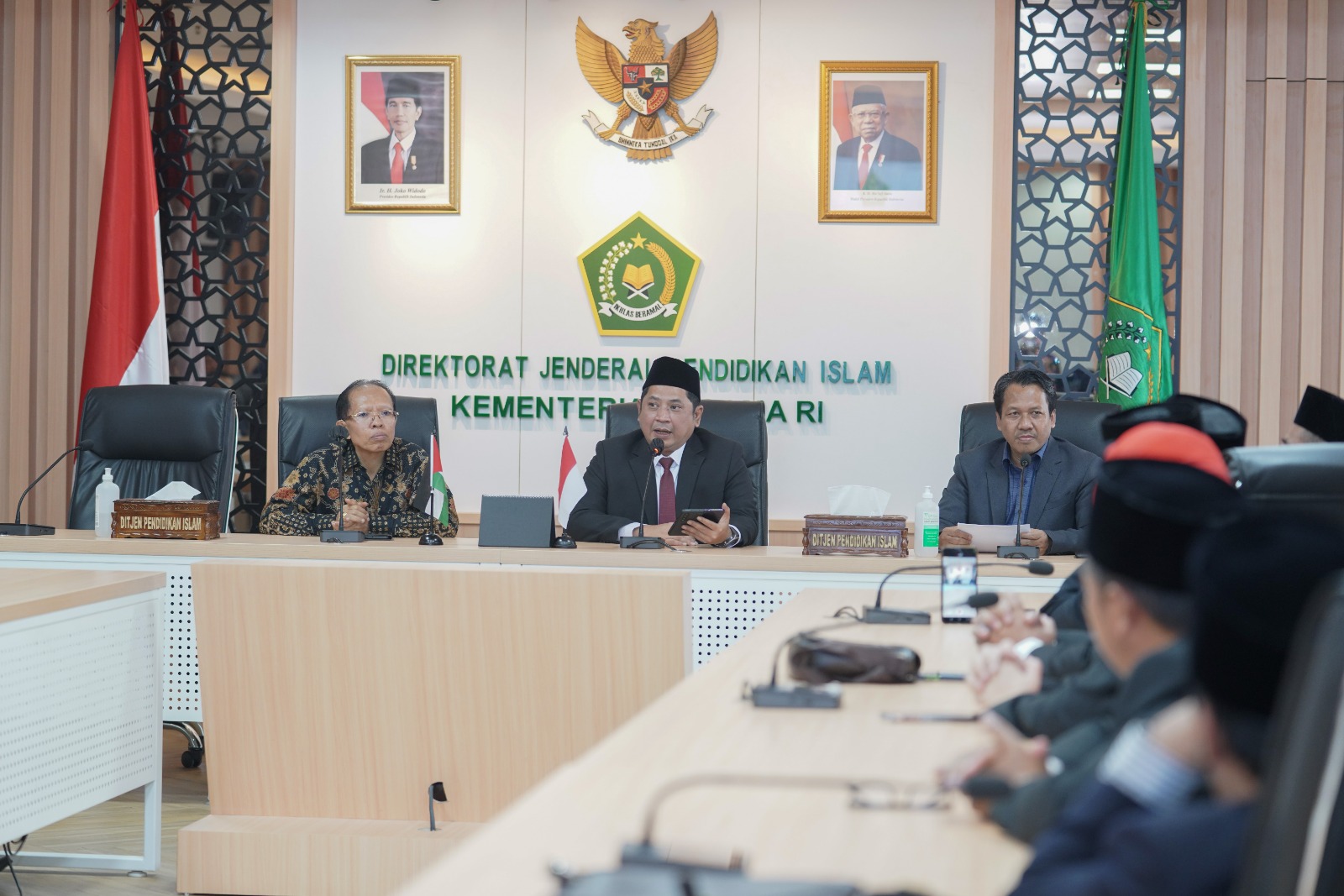 Jakarta—Direktur Jenderal Pendidikan Islam Kementerian Agama RI, Muhammad Ali Ramdhani menyerahkan Keputusan Menteri Agama (KMA) tentang Penetapan Guru Besar Rumpun Ilmu Agama yang diserahkan langsung kepada 62 guru besar di ruang sidang Ditjen Pendis Kantor Pusat Kemenag RI, pada Kamis (14/12).