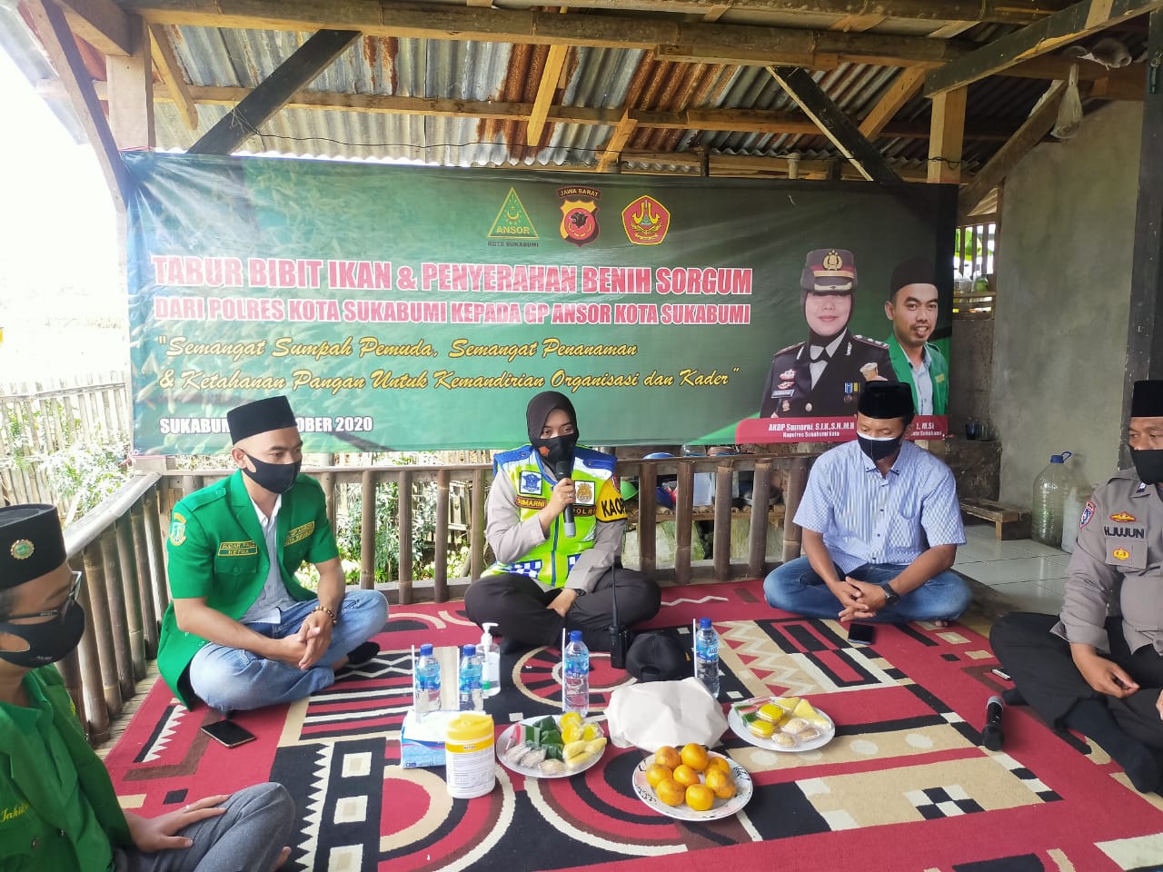 Sudar Fauzi, sebagai Ketua GP Ansor Kota Sukabumi menyampikan dalam sambutannya, “Mengucapkan terimakasih kepada Ibu AKBP Sumarni., S.I.K., SH., MH dan jajaran yang sudah memfasilitasi 10.000 Bibit Ikan untuk Kader Ansor Banser, tentu kegiatan ini menjadi sangat berharga karena di bulan ini ada tiga momentum yang sangat baik, pertama Hari Santri, Hari Sumpah Pemuda dan Maulid Nabi Muhammad SAW, semoga tiga momentum ini menjadi keberkahan dalam upaya ketahanan pangan minimal untuk kader Ansor Banser Kota Sukabumi.
