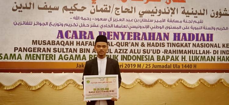 Mahasiswa Prodi Bahasa Arab ini mewakili Indonesia setelah meraih juara 1 hafalan Alquran 10 juz pada acara musabaqah hafalan Alquran dan hadist pangeran Sultan bin Abdul Aziz Alu Su’ud tingkat nasional ke XI di Jakarta Pusat.