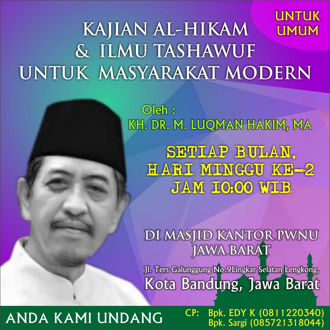 Bandung-, Kajian rutin Tasawuf dan kitab Al-Hikam kembali digelar di Masjid PWNU Jawa Barat, jalan Terusan Galunggung, Kota Bandung, Minggu (11/12) ini pada pukul 10.00 WIB di masjid Kantor PWNU Jawa Barat, jalan terusan Galunggung, Kota Bandung.
