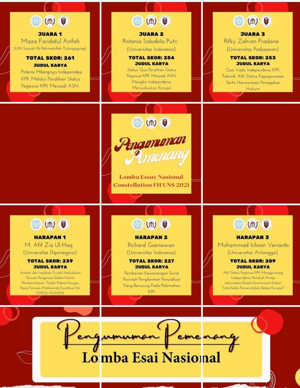Lomba Essay Nasional Constellation 2021, diselenggarakan oleh Komunitas Hukum (Constitutional Law Community) Fakultas Hukum Universitas Negeri Surakarta (UNS). Di gelar secara virtual 15 Juni s.d 10 Juli 2021 dengan tema:“Masa Depan Pemberantasan Korupsi Pasca Revisi UU KPK“.