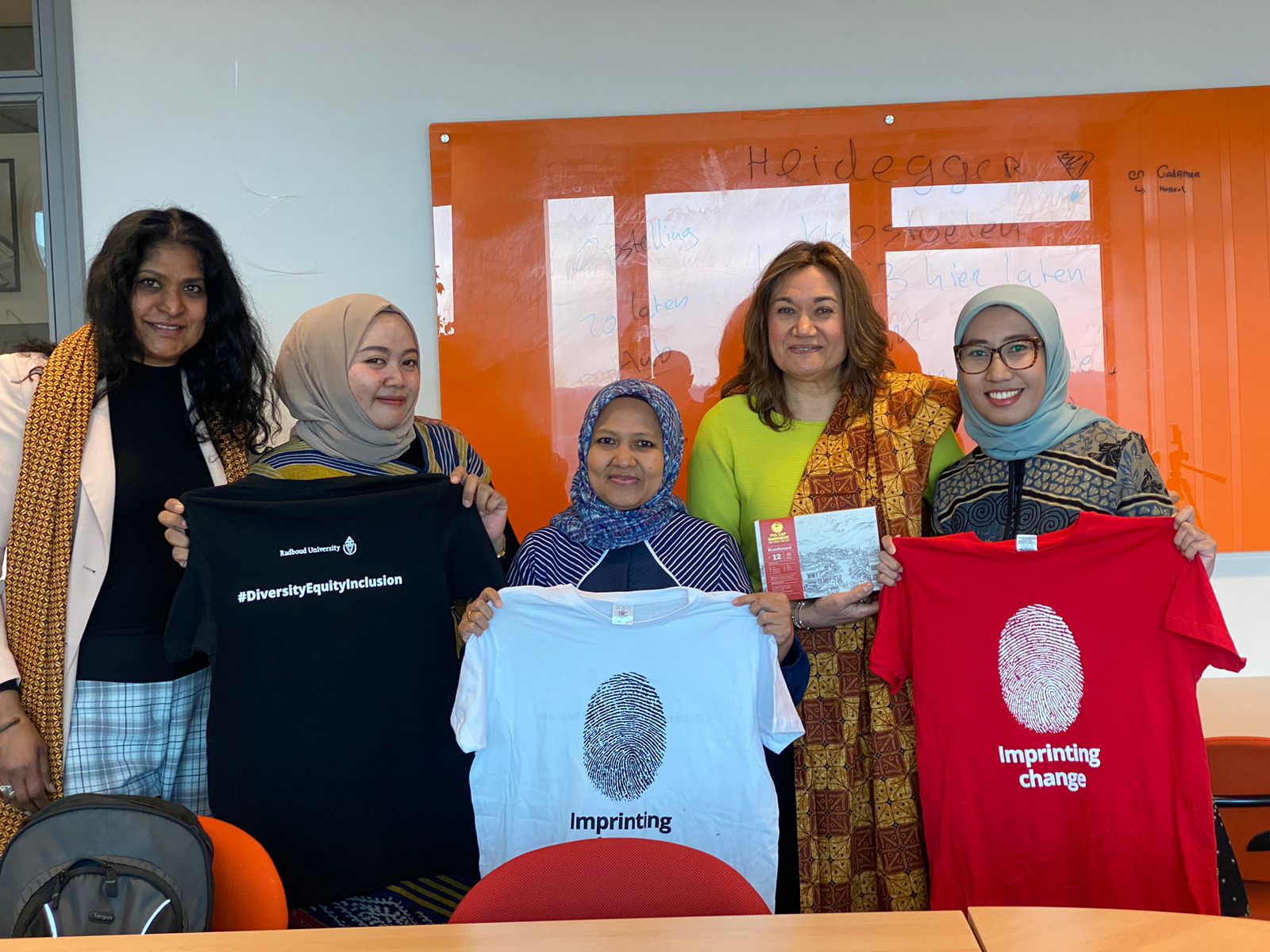 Di akhir acara FGD, Tim Riset UIN Malang memberikan cinderamata dan juga kain batik khas Indonesia, yang kemudian di balas oleh pihak Radboud University dengan memberikan kaos yang bertuliskan “Imprinting Change” dengan tagar #DiversityEquityInclusion.(Alitha)