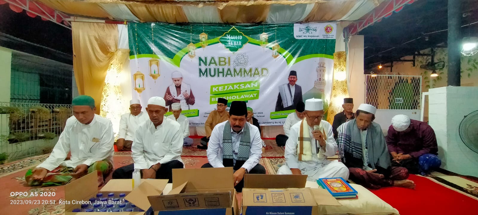 Majelis Wakil Cabang Nahdlatul Ulama (MWC NU) Kejaksan Kota Cirebon bekerja sama dengan Karang Taruna kelurahan Kejaksan menggelar peringatan maulid Nabi Muhammad SAW, pada Sabtu (23/09/2023).