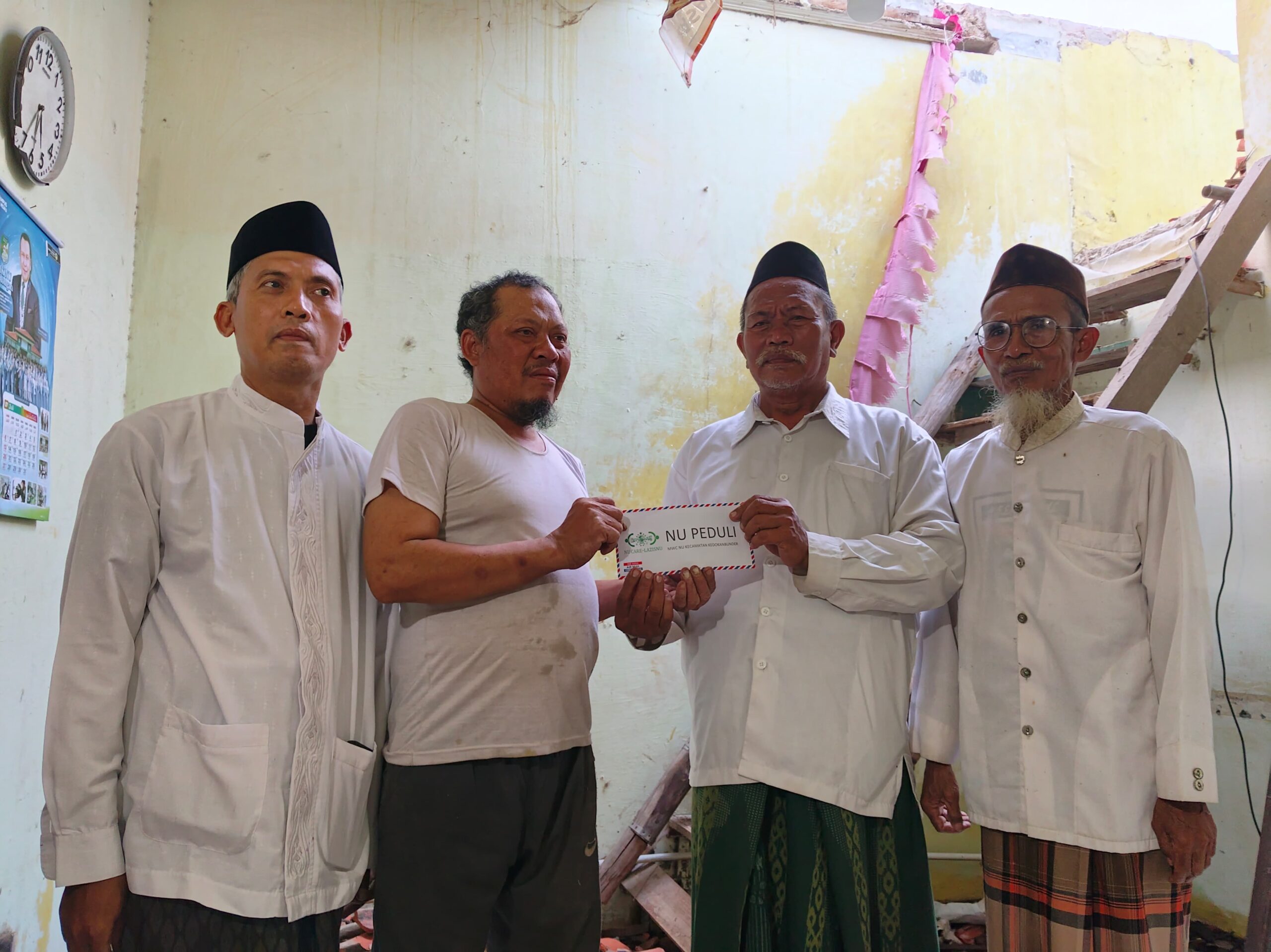 Majelis Wakil Cabang Nahdlatul Ulama (MWCNU) Kecamatan Kedokanbunder melalui NU Care-LAZISNU menyalurkan bantuan kepada warga Desa Kaplongan Lor, Kecamatan Karangampel, yang rumahnya roboh akibat kondisi bangunan yang sudah rapuh. Bantuan berupa uang tersebut diberikan pada Senin (28/7/2025).