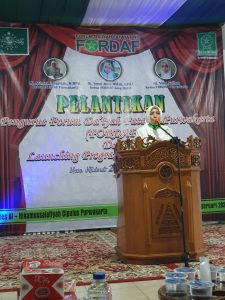 Nyimas D Badriah, ketua PC Fatayat NU Purwakarta menyampaikan dlm sambutannya bhw fordaf yg lahir dr rahim fatayat NU dan merupakan kader da’iyah diharapkan dpt memberikan kontribusi yg nyata di tengah2 masyarakat terutama dlm membentengi faham ahlussunnah waljama’ah dan menyebarkan islam yg rahmatan lil’alamin. Apalagi peran daiyah fatayat sangat dibutuhkan hari ini di dlm upaya menangkal faham radikalisme baik kpd keluarga sendiri ataupun kpd masyarakat luas.