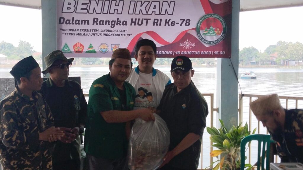 Peringati HUT RI Ke-78, PAC Ansor Cilodong bersama LPM dan KNPI Semai 7800 Bibit Ikan