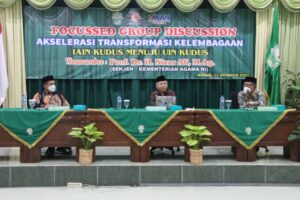 Kudus—Dalam proses transformasi kelembagaan IAIN Kudus menjadi UIN dibutuhkan perencanaan yang matang dan strategi yang jitu. Hal itu disampaikan Sekretaris Jenderal Kementerian Agama RI Prof. Dr. H. Nizar Ali, M.Ag pada Focus Group Discussion (FGD), Jumat (13/8/2021).