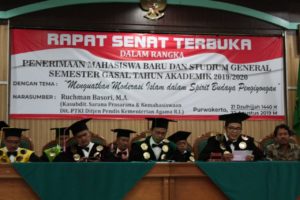 Purwokerto—Jihad hari ini bukan memanggul senjata ke medan perang, tetapi menggerakan pena untuk mencurahkan nalar kritis melahirkan karya intelektual dalam membangun peradaban. Dikatakan Muhammad Roqib Rektor IAIN Purwokerto saat memberikan amanat Rapat Senat Terbuka Peresmian Mahasiswa Baru dan Stadium General, Kamis 22/8.