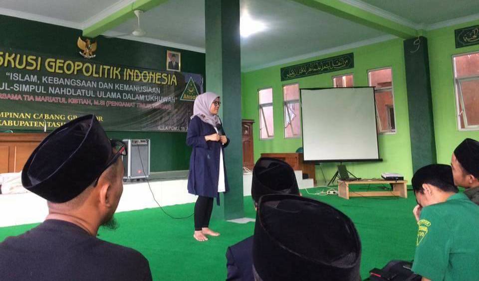 Hal ini disampaikan Tia pada Jumat 16 Juni 2017, dengan tema “Islam, Kebangsaan dan Kemanusiaan; Simpul-Simpul NU Dalam Ukhuwah yang diselenggarakan PC Gerakan pemuda Ansor Kabupaten Tasikmalaya. Hadir pada kesempatan itu, KH. Atam Rustam, Ketua NU Kabupaten Tasikmalaya, serta pimpinan, kader dan anggita PC GP Ansor Kabputaen Tasikmalaya serta kader NU lainnya.(*)