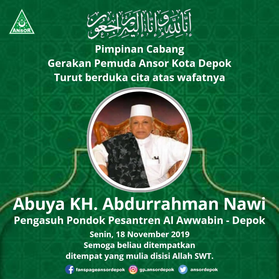 Depok. Beredar berita duka melalui pesan Group WhatsApp: “Innalilahi wa Innailaihi Rojiun, telah pulang ke Rahmatullah Abuya Abdurrahman Nawi (Pimpinan Ponpes Al-Awabin).” Pada hari Senin Siang, pukul 13.57 Wib. ( 18/11/2019).