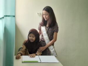 KOTA BEKASI – Gadis cantik asal Kota Bekasi yang berhasil memenangkan kontestasi Putri Anak Indonesia tingkat Provinsi Jawa Barat 2023, Zahira Khairani (12) kunjungi Sekolah Luar Biasa (SLB) Terpadu, Jl Margajaya, Bekasi Selatan (11/10/2023).